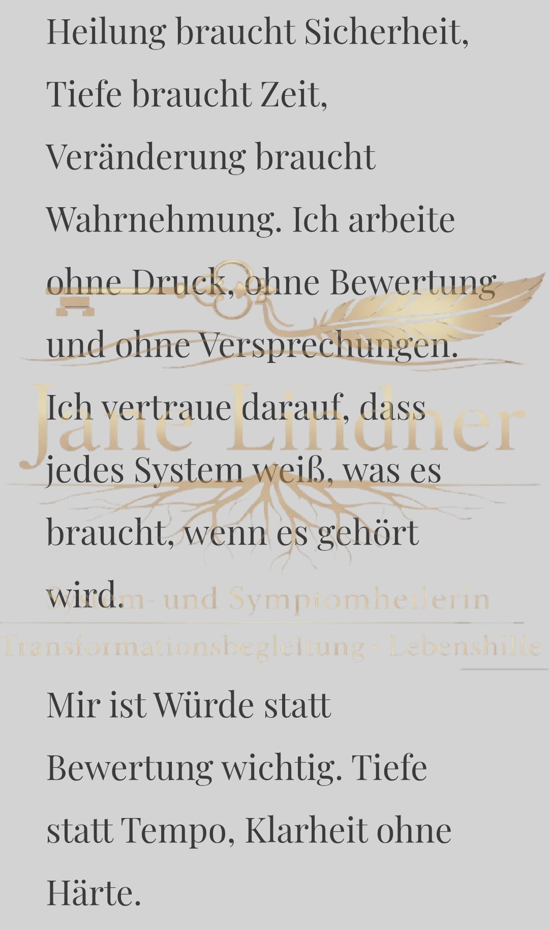 Ich stelle keine Diagnosen. Ich verspreche keine Heilung. Ich führe keine medizinischen Eingriffe durch und verschreibe keine Medikamente.